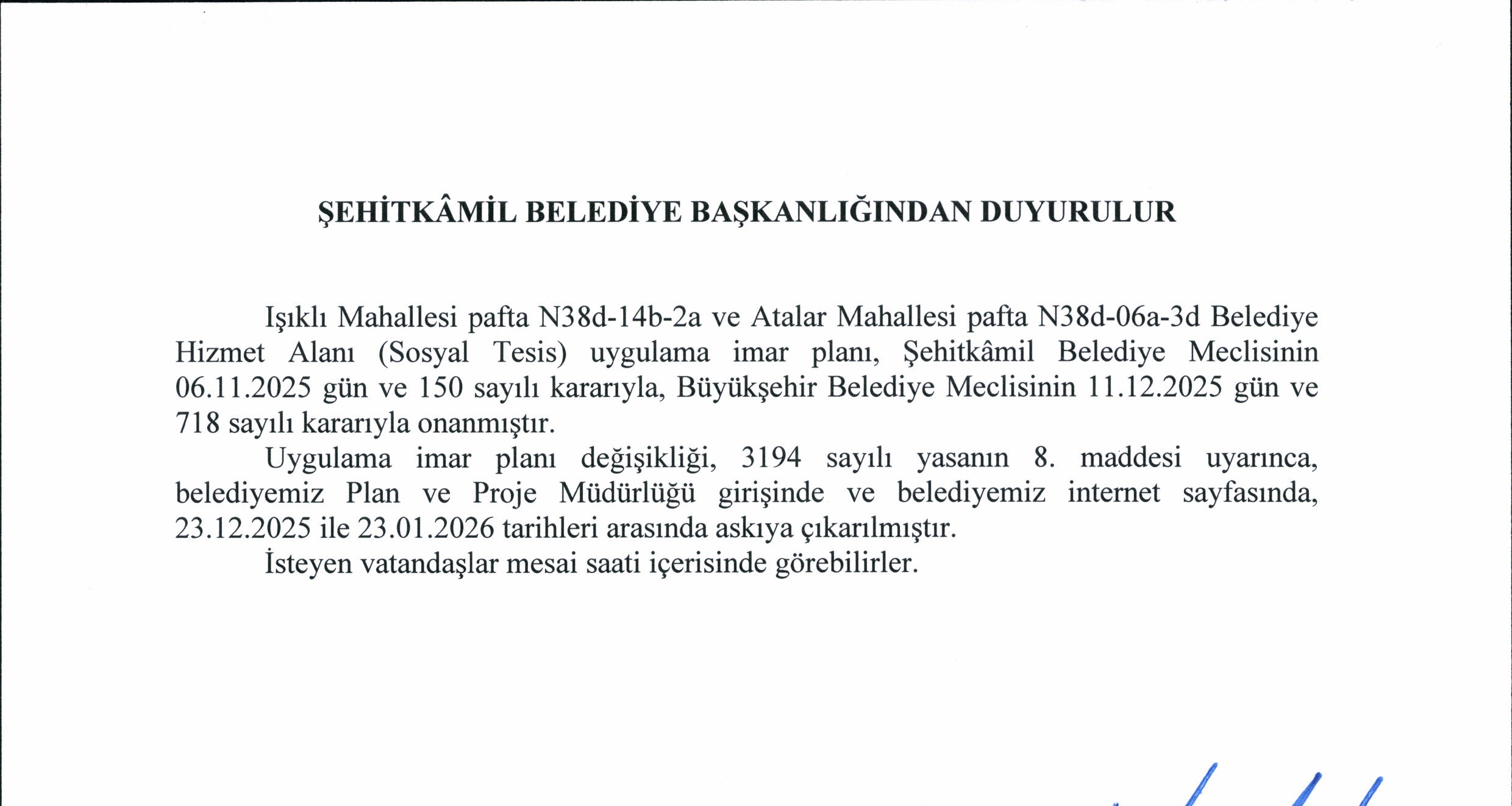 Işıklı Mahallesi ve Atalar Mahallesi Belediye Hizmet Alanı (Sosyal Tesis) Uygulama İmar Planı Değişikliği