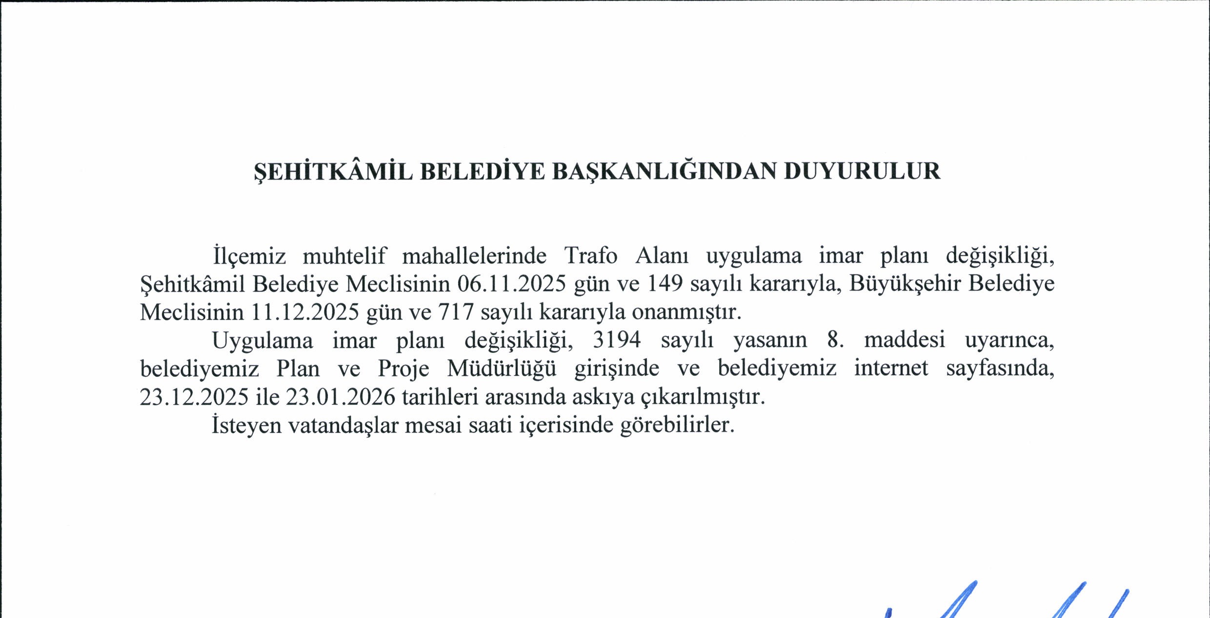 - İlçemiz Muhtelif Mahallelerinde Trafo Alanı Uygulama İmar Planı Değişikliği