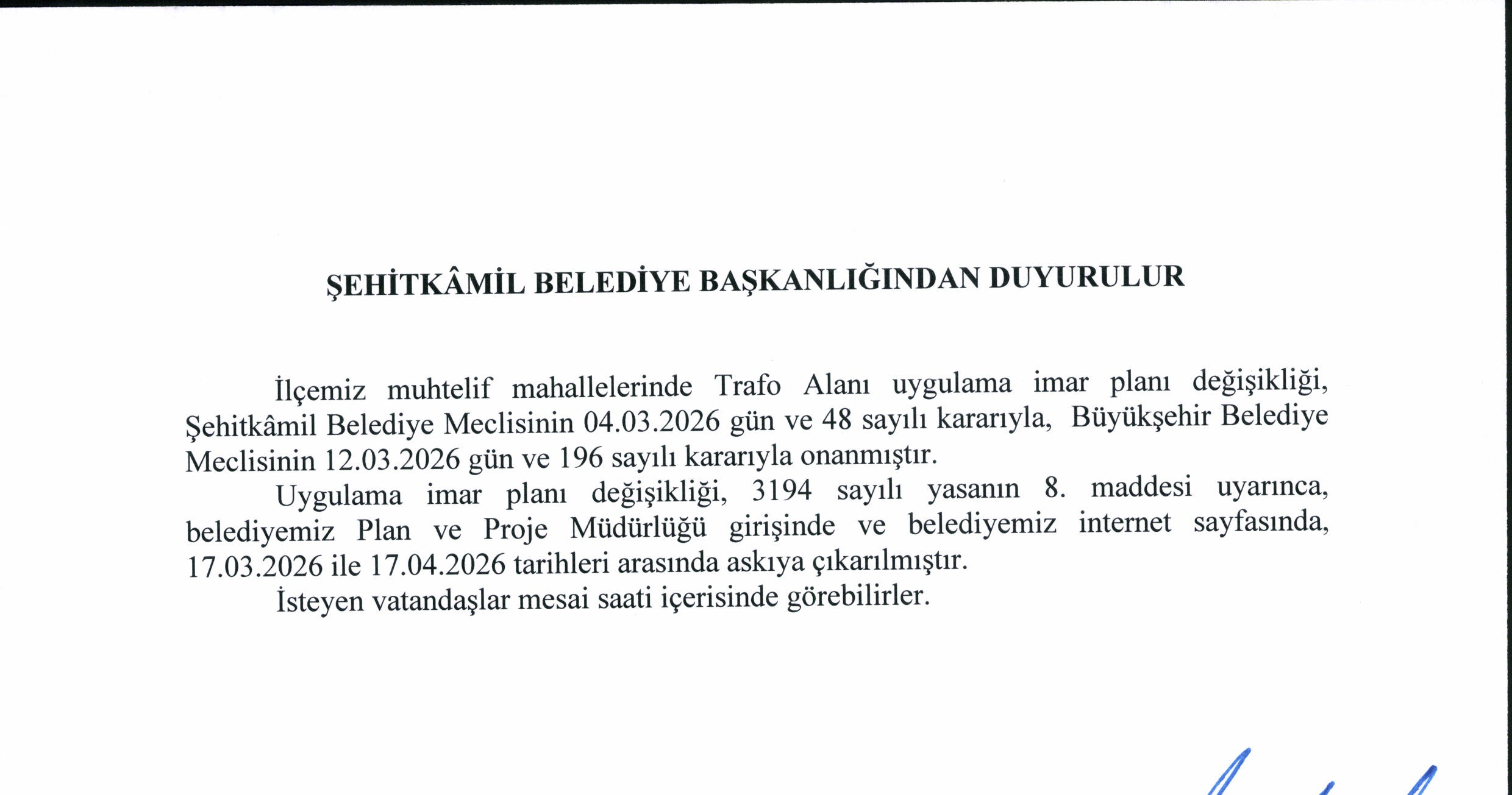 İlçemiz Muhtelif Mahallelerinde Trafo Alanı Uygulama İmar Planı Değişikliği