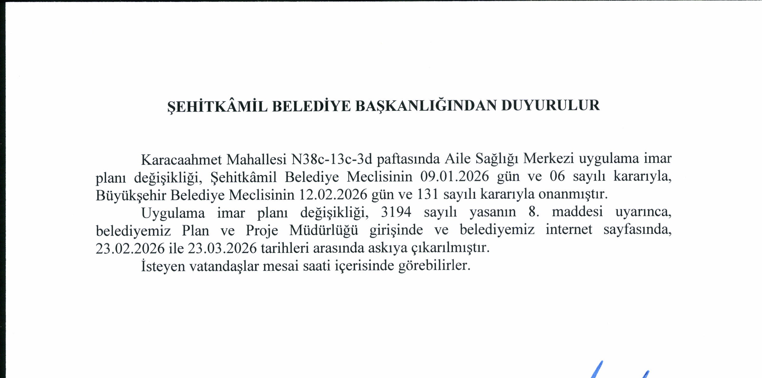 Karacahmet Mahallesi Aile Sağlığı Merkezi Uygulama İmar Planı Değişikliği